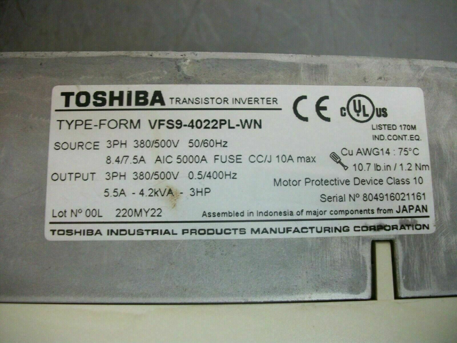 TOSHIBA 3HP TRANSISTOR INVERTER DRIVE VFS9-4022PL-WN 3PH 500VOLT 5.5AMP 4.2KVA