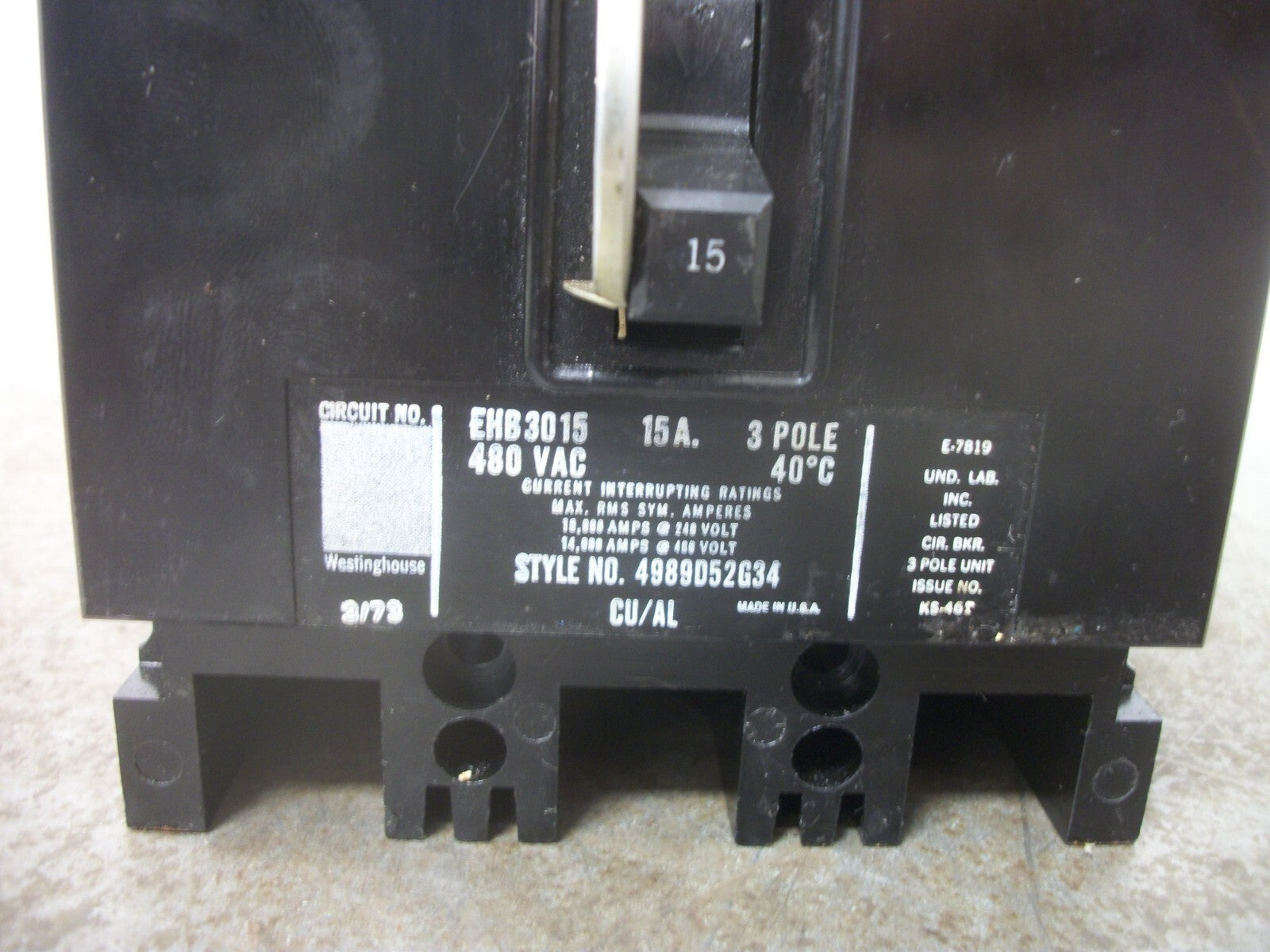 WESTINGHOUSE EHB CIRCUIT BREAKER EHB3015 15AMP 480VOLT 3POLE
