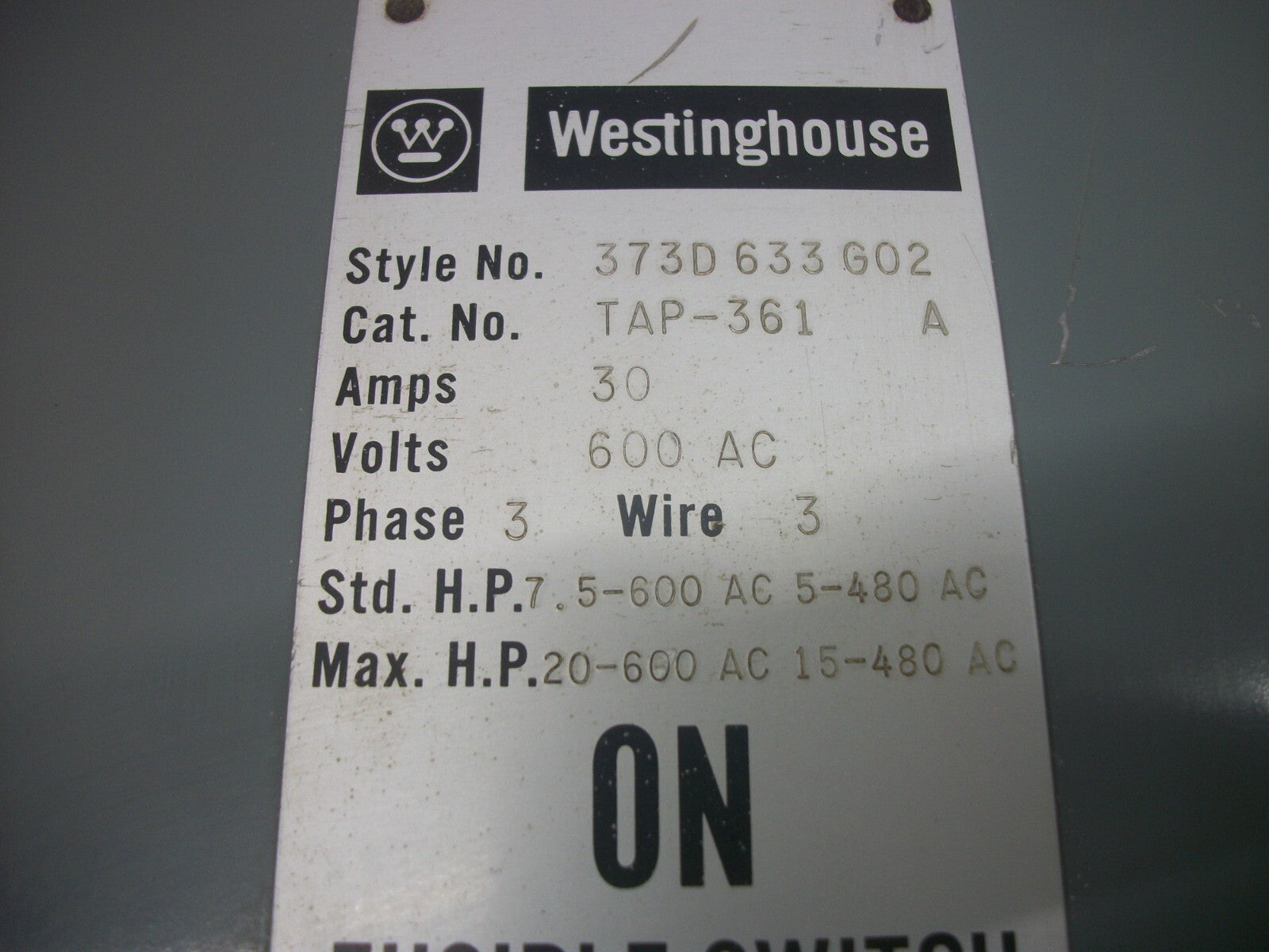 WESTINGHOUSE FUSIBLE BUS PLUG TAP361 30AMP 600VOLT 3POLE