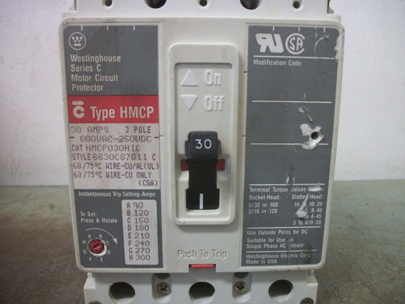 WESTINGHOUSE HMCP CIRCUIT BREAKER HMCP030H1C 30AMP 600VOLT 3POLE